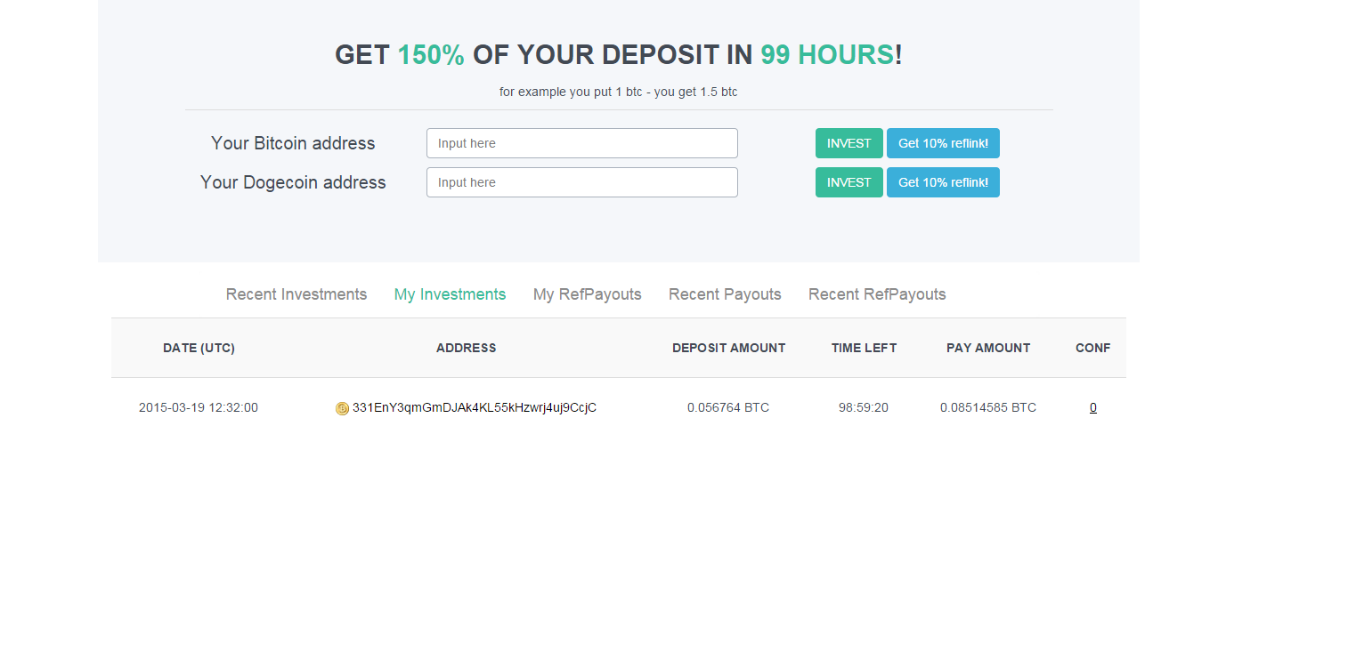 დავაი ბიჯები ამ საიტს შევუტიოთ ეხლა. დოუბლექოინის ნაირია მაგრამ ეს იხდის 150% ს ჩადებულის 99სათში .