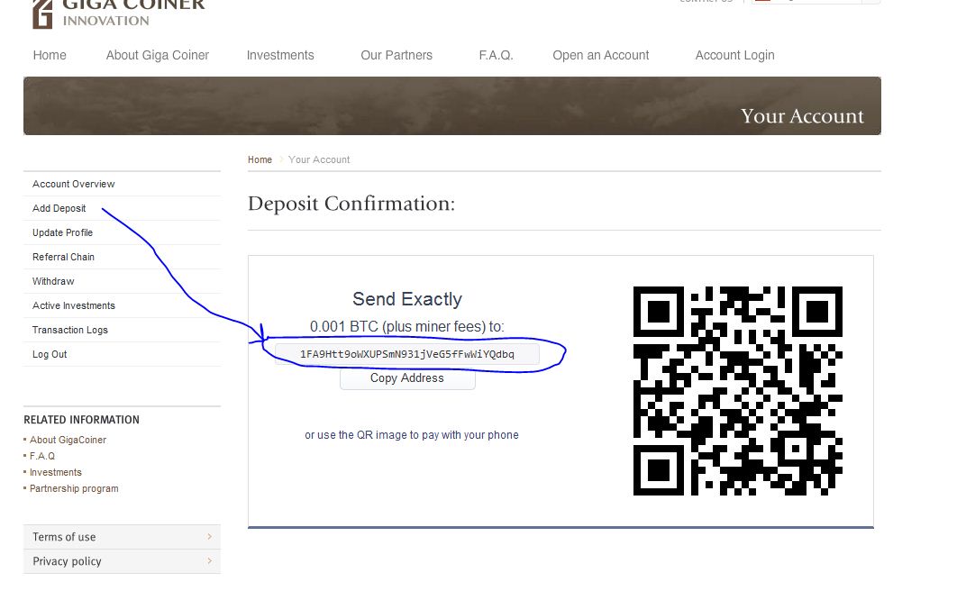 როგორ ჯიგარო და შეხვალ მაგ საიტზე სექცია add deposit და მერე საფულე რომ მაქ მითითებული blokchain -ის იქიდან დარიცხავ იმ გრძელ ბიტკოინ კოდზე რომელზეც მიგითითებს გიგაკოინერი ჩარჩოში... ოღონდ გაითვალისწინე მინიმალური დეპოზიტი 0.001 BTC - ა ))) და მინიმალურზე 4 პროცენტს გიმატებს დღეში. ნუ ვისაც მეტი აქვს ბითკოინი იმას მეტს მოუმატებს. მაგალითად 1 ბითკოინზე 4.5 % -ს