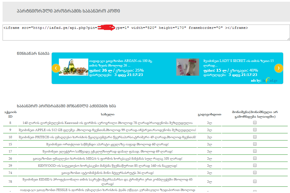 მეგობრებო დავამატეთ განყოფილება საბანერო კოდი სადაც ასევე შეგიძლიათ იხილოთ თუ რამდენს მიიღებთ თითო გაყიდვაზე