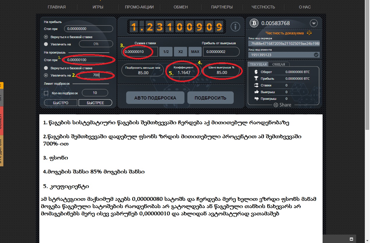 აგერ პატარა სქრინი ჩემი კონფიგურაციით. ყოველთვის არ ამართლებს მაგრამ ამართლებს თუ დღეში ერთხელ შევდივარ წაგებისას სტავკას ხან 2-3 000 სატოშამდე ვწევ ინსტიქტურად ვაკეთებ უკვე ფსონს ვურევ რომ პროგრამამ არ გამოითვალოს კომბინაციები. 10-15 საკმარისია