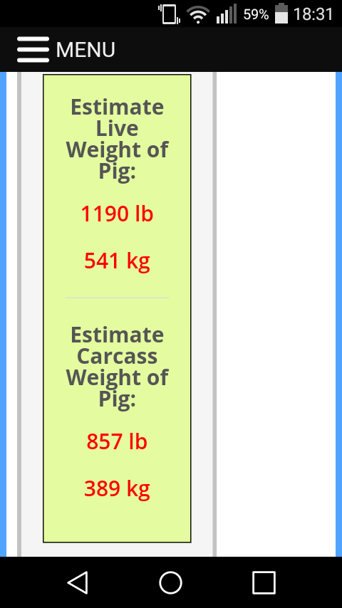 თემას ვკითხულობ და რომელიღაცა გვერდზე გქონდა კითხვა ზომებით ჩემი ღორის წონა როგორ გავიგოო, რაღაცა ცხრილი ედო ვირაცას რომელშიც არ ჯდებოდა შენი ზომები და აი ონლაინ კალკულატორი და შეგიძლია გამოთვალო აქ შენც და ყველამ ვისაც გაინტერესებთ ზომებით ღორის წონის დადგენა