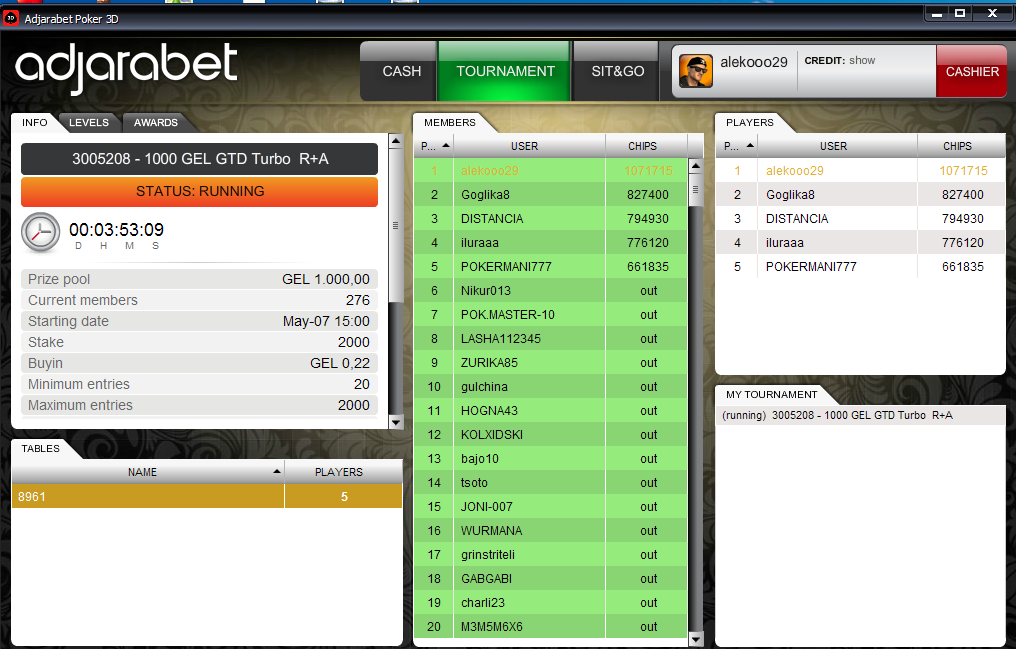 რა გამოვარდი? კითხვა არ იცი???????? აი შეხედე რა ხდება ეხლა ამ ტურნირში 5 კაცი ვართ დარჩენილი არავის გვიშვებს შიგნით თავისით თამაშობს ბლაინდებს ატანს ერტთმანეთს და საპრიზოები რანაირად უნდა განაწილდეს თავისით ვისაც მოაგებინებს??? ეგ სამართალი იქნება? აი სურათი ჩამითვალეთ მაშინ პირველი ადგილი და ჩამირიცხეთ პირველი ადგილის ფული!!!