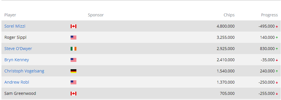 Player Sponsor Chips Progress Sam Greenwood CA 1,073,000 153,000 Mike McDonald CA 749,000 -31,000 Andrew Robl US 734,000 271,000 Christoph Vogelsang DE 697,000 27,000 Carlos Chadha CA 683,000 13,000 Vladimir Troyanovskiy RU 637,000 309,000 Bryn Kenney US 626,000 328,000 Sorel Mizzi CA 577,500 185,500 Erik Seidel US 546,000 286,000 Jason Mercier US PokerStars PokerStars Team Pro 540,000 20,000 Justin Bonomo US 511,000 -65,000 Keith Lehr US 501,000 84,000 Bill Perkins US 479,000 -36,000 Paul Newey GB 470,500 306,500 Zach Hyman US 462,000 -165,500 Sean Winter US 434,500 24,500 Jason Koon US 370,500 370,500 David Peters US 365,000 -113,000 Dani Stern US 348,500 103,500 Mohsin Charania US 337,500 -12,500 Zhou Zhou CN 332,000 25,500 Talal Shakerchi GB 324,000 324,000 Pratyush Buddiga US 318,000 -136,000 Roger Sippl US 317,500 65,500 Daniel Negreanu CA PokerStars PokerStars Team Pro 303,000 -17,000 Isaac Haxton US PokerStars PokerStars Team Pro Online 275,500 35,500 Fedor Holz DE 271,000 -139,000 Noah Schwartz US 261,500 121,500 Max Altergott DE 256,000 256,000 Scott Seiver US 214,000 -315,000 Ivan Soshnikov RU 201,000 -72,500 Steve O'Dwyer IE 193,500 -56,500 Sam Trickett GB 190,000 -90,000 Ole Schemion DE 187,500 57,500 Jason Les US 152,500 -47,500 Cary Katz US 107,000 -34,000 Dong Kim US 107,000 -12,000 Daniel Colman US 84,000 17,500 Igor Kurganov RU 63,000 -247,000 Mike Watson CA Busted Dan Shak US Busted Donald Rae GB Busted Stephen Chidwick GB Busted Vanessa Selbst US PokerStars PokerStars Team Pro Busted Jake Schindler US Busted Byron Kaverman US Busted Andrew Chen CA Busted Olivier Busquet US Busted