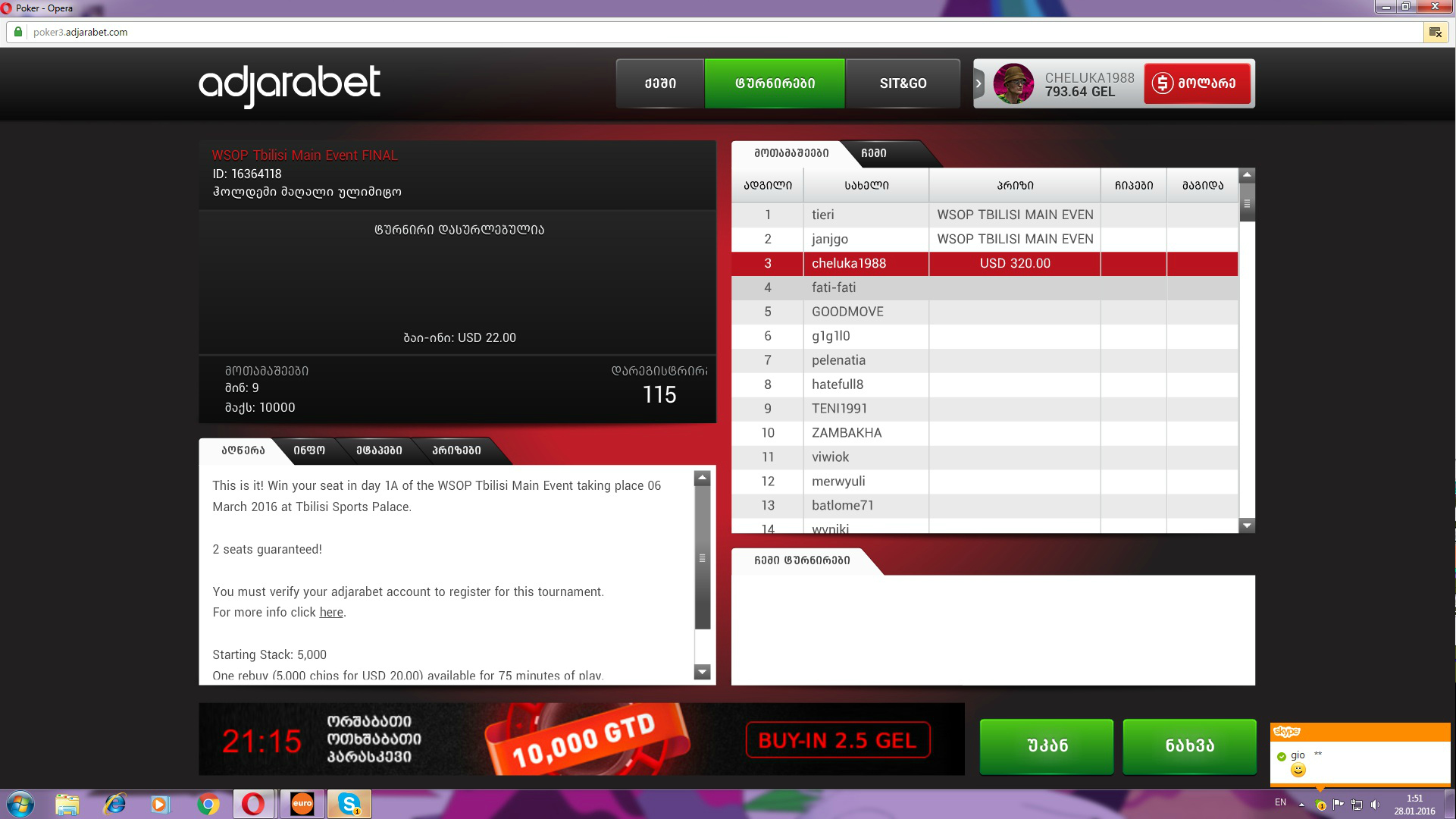 გაჭირვებას რა ვუთხარი გუშინ Main ivent-ის ბილეთი ხელში მეკავა და ფული ავიღე სხვას გავატანე ფიშკები, სულ რაღაც 2.2 დოლარად მქონდა ეს მოგებული, არანაირი რებაი და არანაირი ედ-ონ.... მარტამდე იმედი მაქვს მოვიგებ აუცილებლად