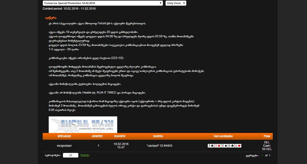 აქცია მხოლოდ ფორუმელებისთვის, 250 ლარი დღეში ტოპ 5 საუკეთესო კომბინაციას პოკერში