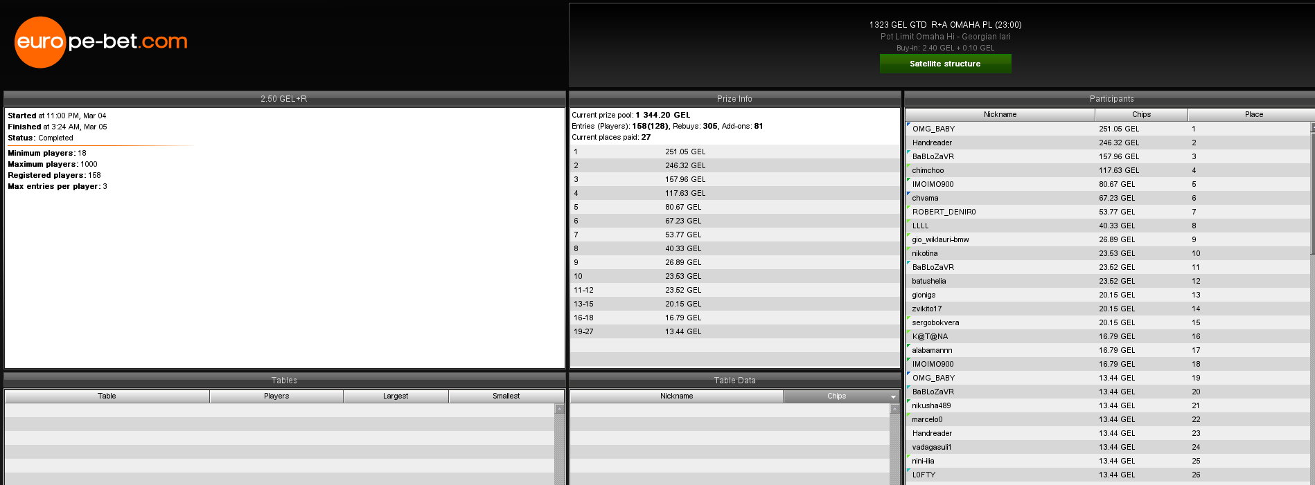 გუშინ აღარ მითამაშია საერთოდ. ეხლა დავიწყე 1.1 ტუნრირი ომაჰის აჭარაზე . 20:00 ზე ვიწყებ ევროპაზე 2.5 იან ომაჰას + 22:00 ზე 5.5 1R აჭარაზე და 23:00 ისევ ევროპის ომაჰა . გლ მე მინ 1 ტურნირი მაინც უნდა დავდო. დროა