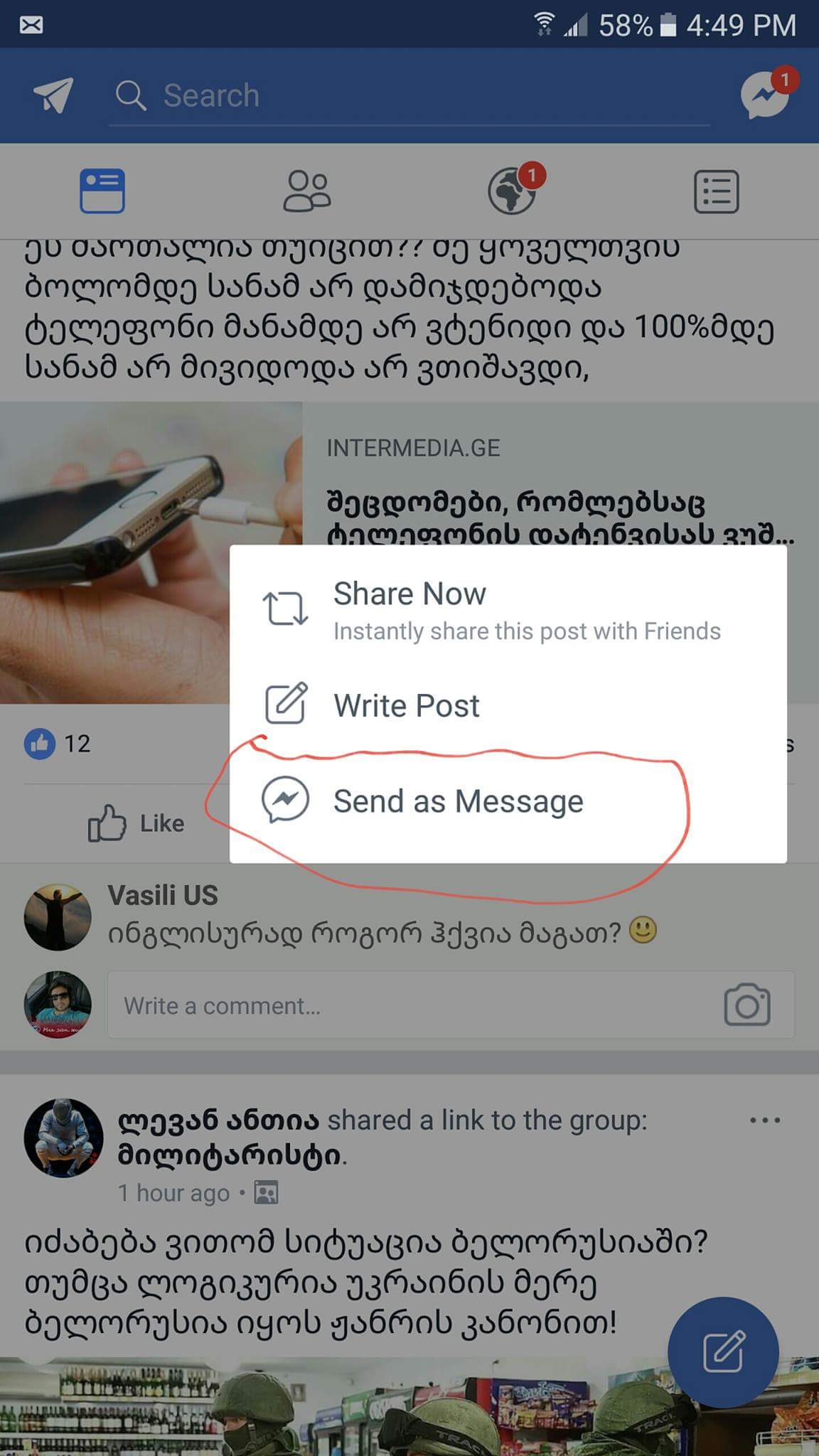 დედაჩემის LG G4 ზე fb აპლიკაციას ასე ვთქვათ შეარი მესენჯერში აღარ აქვს... აი ნებისმიერი სტატია ფოტო და ა.შ შეარს რო ვაწვებით ხო ჩნდება: share now, write post და send as message... აი ეს ბოლო არ აქვს საერთოდ.. არ ჩანს... მხოლოდ ზედა 2 ია და ხომ არ იცით რაშია საქმე?