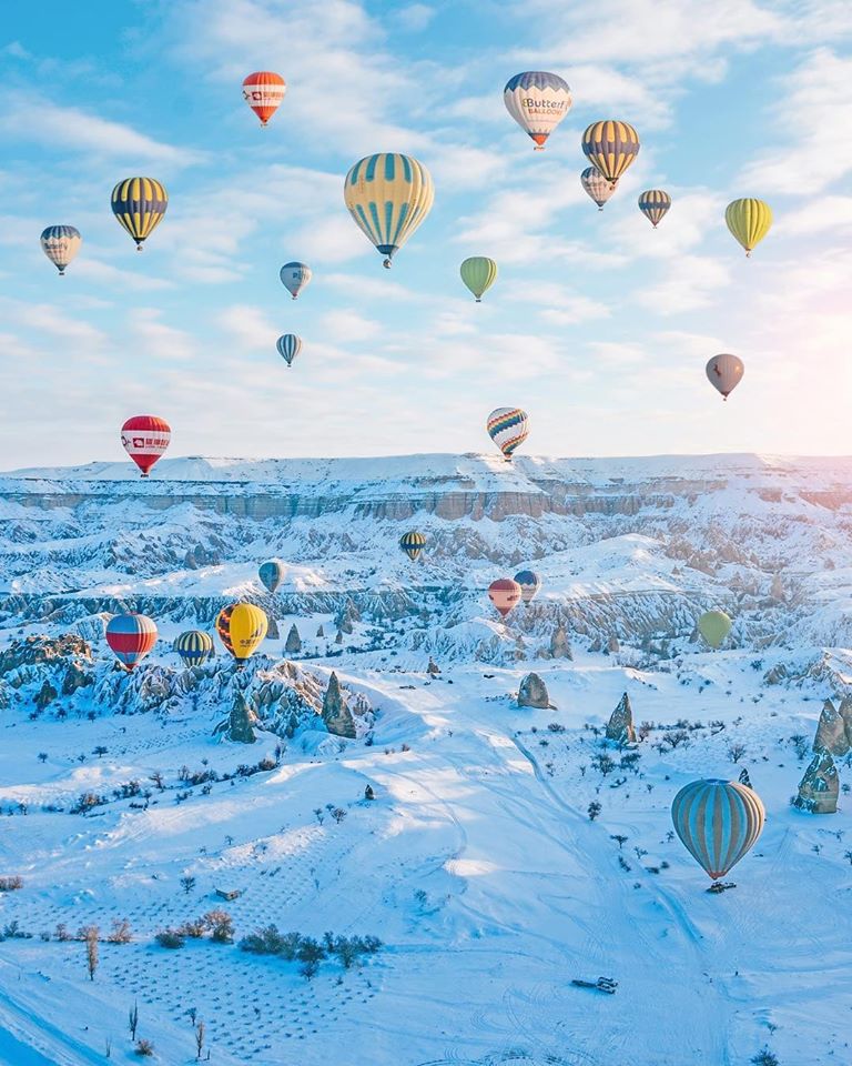 Hot air balloon rides over a snowy landscape of Cappadocia