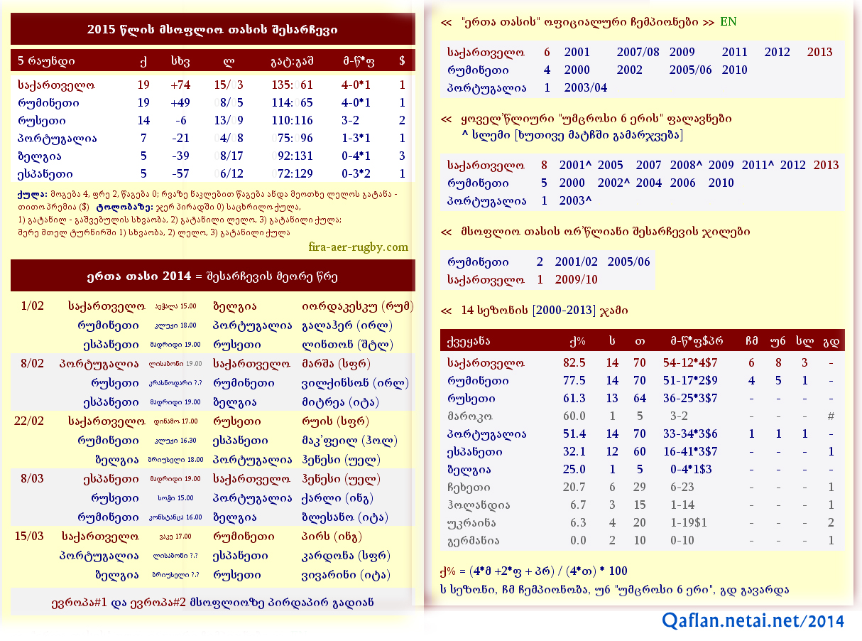 ბევრჯერ თქმულა, ქართველობას რაგბი მარტო დათვებთან რკენის წინ ახსენდებაო. არსებობს სხვა კატეგორიაც - ვისაც რუმინეთიც იზიდავს და შორეული სამოაც. ვაი, რომ კიდევ უფრო ცოტას გაუგია ზე15, ოთხი ერი (ფალავნობა, ნრლ და ორიჯინი, მაგრამ მრგვალი ბურთის მეფსონე ფანიც კი საკადრისად აფასებს ნაქებ "ექვსი ერს"