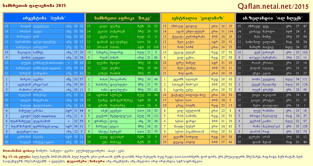 რომელიც პირველად ჩატარდება ზე’უცნაურად - ცალ, გაუწონასწორებელ წრედhttp://Qaflan.netai.net/2015/რაგბეთი, მეტადრე კი ზელანდია და ავსტრალია, ზღვისრეთის ვალშია: სამოა - ტონგა - ფიჯის უკეთეს მოთამაშეებს იბირებს, იქ სატესტოდ ჩასვლას კი არ კადრულობს, ესაო და მაქედან ხეირი ცოტა შემომივაო.