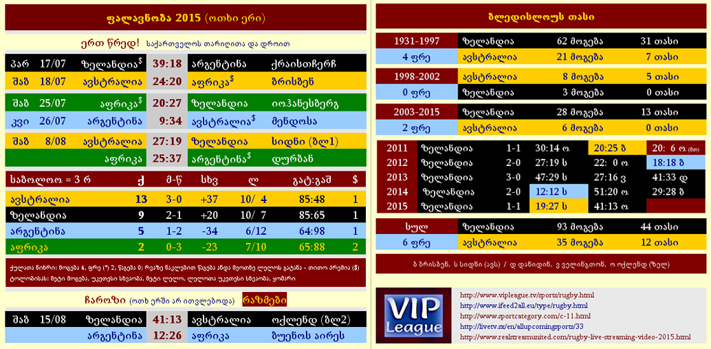 და მე-13 წლითაც შეინარჩუნა სამეზობლო "ბლედისლოუს თასი"http://Qaflan.netai.net/2015"ოლ ბლექსი" წინა მსოფლიო თასის აქეთ სულ 3-ჯერ დამარცხდა. კივებს ოქლენდის "იდენ პარქზე" 1994 წლის აქეთ აღარ წაეგოთ, ოზები კი მაგ არენაზე 1986 წლის შემდეგ მიჯრით 15-ჯერ ჩაჭრილიყვნენ.