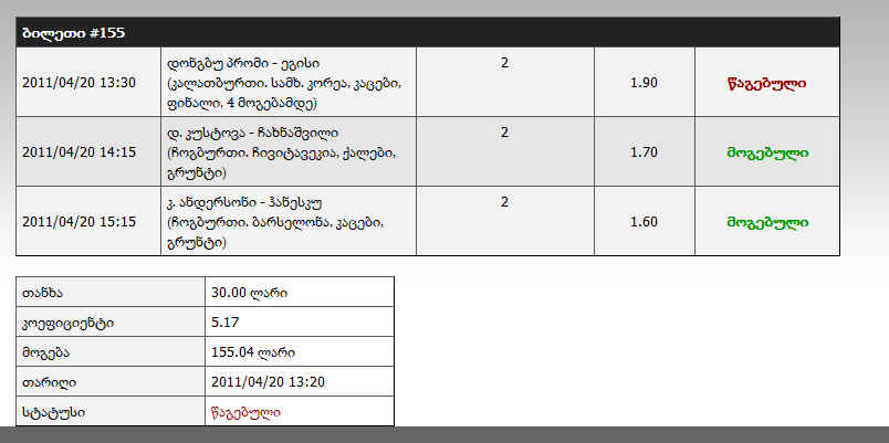 ვიღაც ბარსელონელმა ### ჩოგბურთელმა რომელსაც კუში ქონდა 1.15 გამიპუჩა 120 ლარიანი ბილეთი დანარჩენები კველაფერი მიდის რაც მიდევს თფუ იბიომატ 40 კუშიანი ბილეთი 5 გუნდით