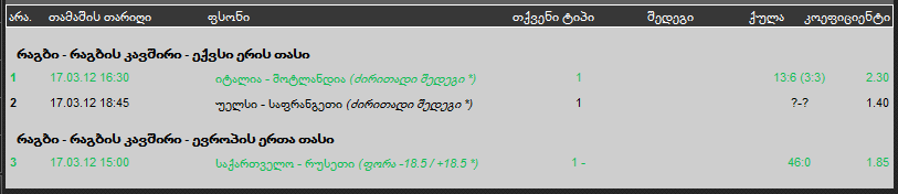 7 17.03.12 18:30 ლევერკუზენი - გლადბახი (პირველი ტაიმის გოლების რაოდენობა 0.5 *) მეტი 1:2 (0:1) 1.38