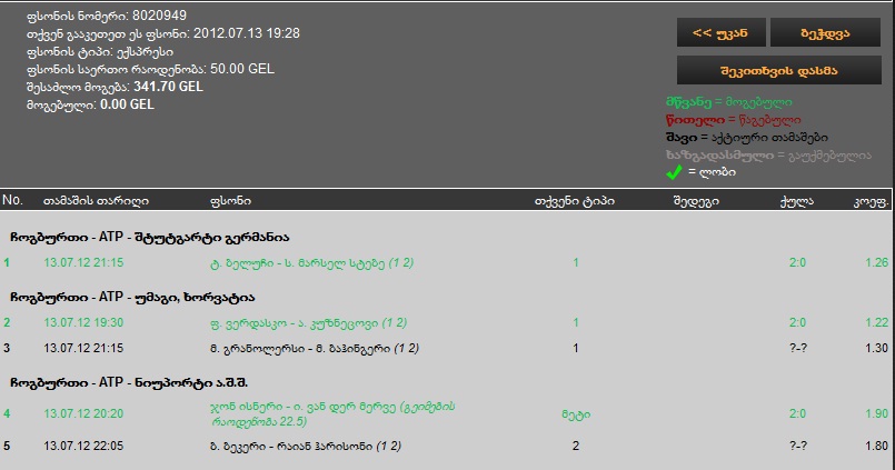 მოკლედ მოიგო და მოვიგე მეც ნერვიულობა კი მომიწია , ბოლო ფული იყო 0-ზე ვრჩებოდი რო წამეგო