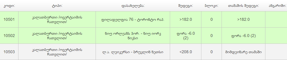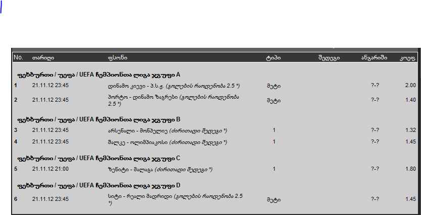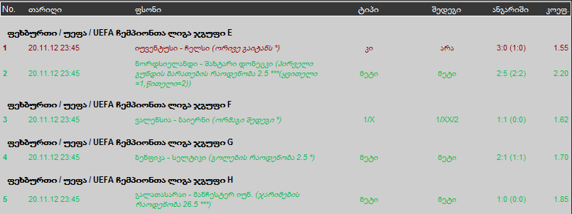 4 20.11.12 23:45 ბენფიკა - სელტიკი (პირველი გუნდის ბურთის ფლობა 55.5 % ) მეტი მეტი 2:1 (1:1) 1.85