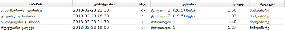ფეხბურთი / გერმანია / 3. ლიგა3 23.02.13 17:00 საარბრიუკენი - კარლსრუე (ძირითადი შედეგი *) 2 ?-? 1.80