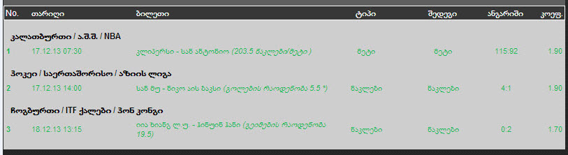 3 18.12.13 14:30 მ. შაზალი - ჯ. კანარი (ფორა -6.5/+6.5 *) 1 ?-? 1.85