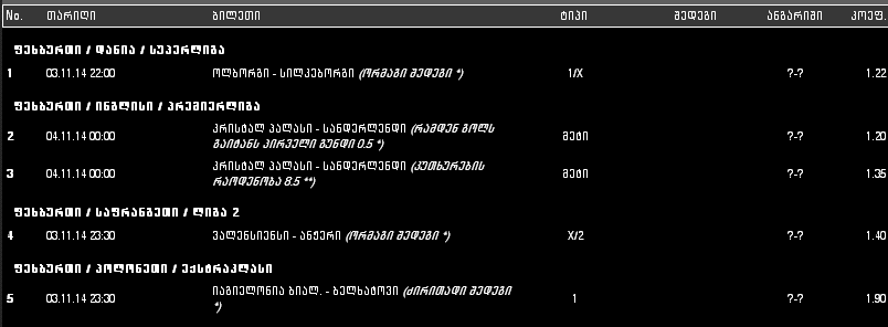 1 04.11.14 00:00 კრისტალ პალასი - სანდერლენდი (რამდენ გოლს გაიტანს პირველი გუნდი 0.5 *) მეტი ?-? 1.20