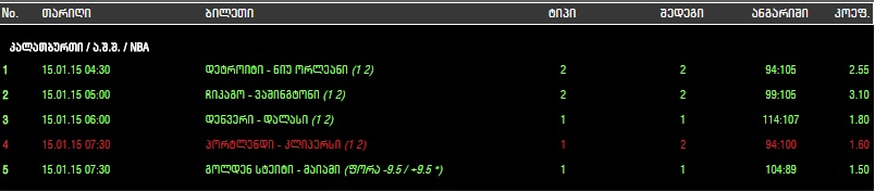 1 15.01.15 04:30 დეტროიტი - ნიუ ორლეანი (1 2) 2 2 94:105 2.05