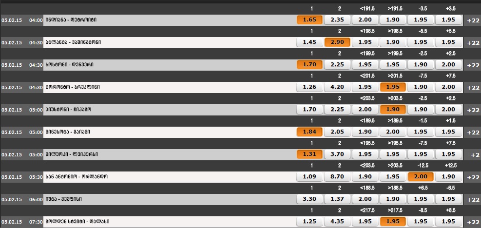 4 05.02.15 04:30 ბოსტონი - დენვერი (ფორა -2.5 / +2.5 *) 2 ?-? 2.00