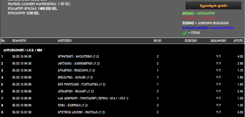6 05.02.15 05:30 სან ანტონიო - ორლანდო (ფორა -12.5 / +12.5 *) 1 ?-? 2.00