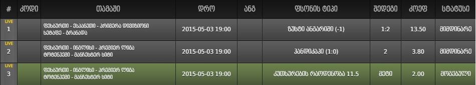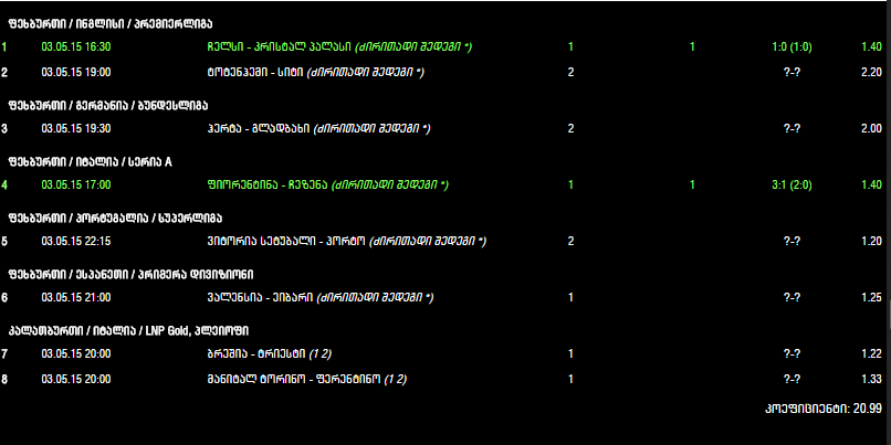 აი მაგათ მოგებაზე მაგრად დღეს არაფრის არ მჯერა მარა რავიცი ყველაფერი ხდება და დააზღვიე თუ გაქ ვარიანტი მარა მე უკვე მწვანედ ვხედავ მაგ ბილეთს პირადად