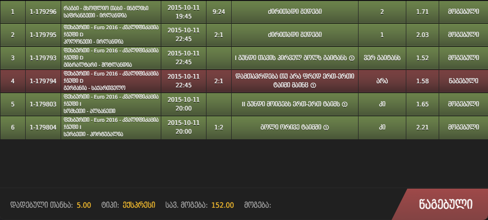 Tipo de apuesta Número de apuestas Total importe apostado Ganancia posible Ganancia