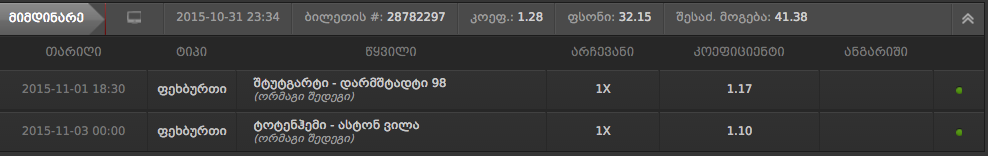 კაროჩე ხვალ ამ ბილეთს ველოდები და რო მოვიგებ ამ 41 ლარს დავუდებ 1/X -ს ესეიგი.