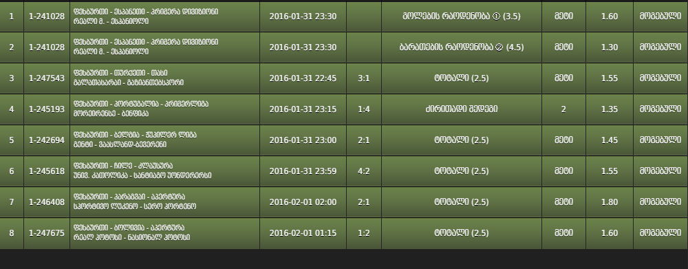 პირველი ბილეთI იღებს ბონუსო წესებშI,რომ უწერიათ. პირველი გავაკეთე ნ ლარის და დავწერე 8 იგრა ,მაგრამ ერთI თამაში იყო 1.14 კოეფიციენტი,ხოლო მესამე ბილეთI გავაკეთე 5 გადაბმა იყო 5 ლარში და წავაგე და არ დარიცხავენ ?