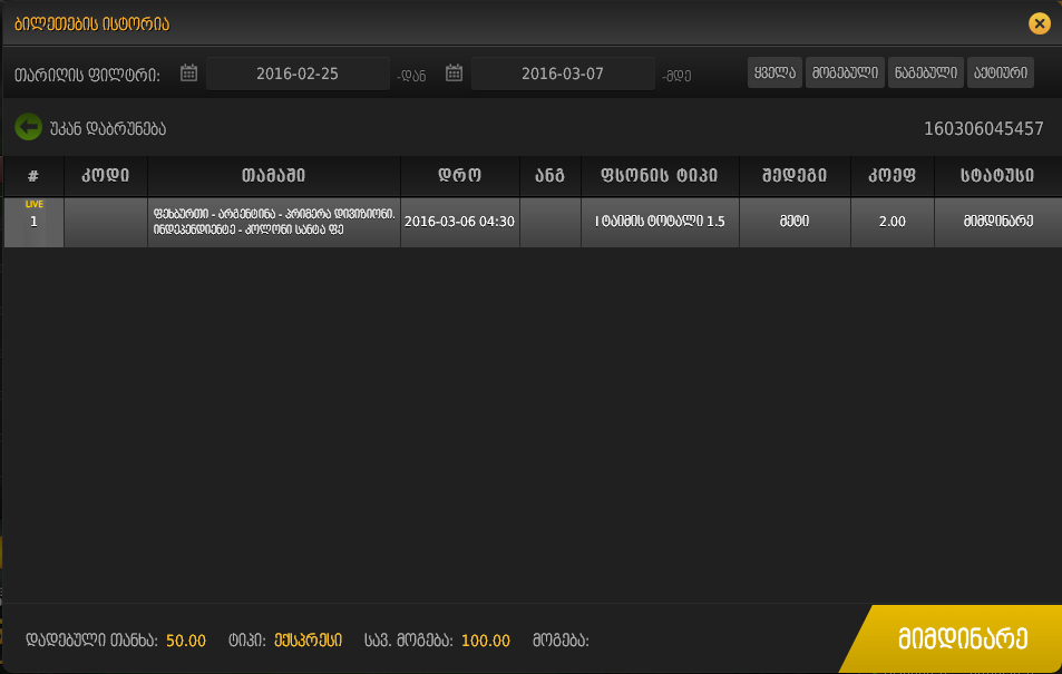 თუ ვინმეს შეგიძლიათ დამიდეთ 10$ ტაიმის დამთავრებისთანავე გადმოგირიცხავთ ნებისმიერ ტოტალიზარტორში.