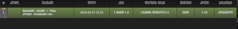მაგარი გუნდი ###ობასთან 0-1 აგებდა და კიდე 2 გოლი ავირე 1.55ად 20 წუთი დარჩა ბლიად.