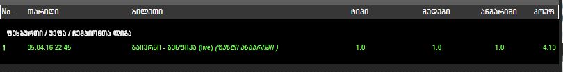 1 06.04.16 01:00 სერო პორტენო - სპორტივო ლუკენო (I ტაიმის გოლები 0.5 *) I ტ- მეტი ?-? 1.30