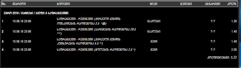 საერთო გასავალი 150 000 ლარი... თუ ფრანგები მოიგებენ 175 000 ავიღებთ ანუ მოგება თავზე 25 000 ლარი, თუ X2 წამოვა 160 000 ავიღებთ, ანუ მოგება თავზე 10 000 ლარი...