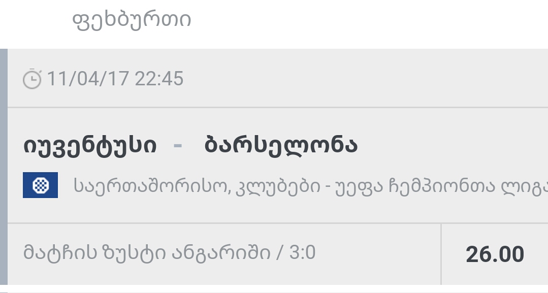 ბიჭო არ მესმის ბარსას X2 რატო გეგონათ? იუვე იმდენად ### გუნდია რო სახში არ ეცდება მოგებას? მერე რა რო ბარსაა, მეც ბარსას ფანი ვარ მარა X2 მეც არ მგონებია დღეს