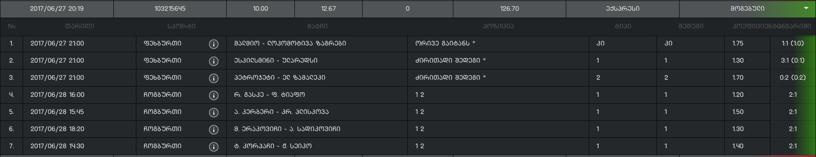 თან რატო მეშლება ნერვები იცი. ვერ ვურისკავ მაგალითად 2-3 თამაში რომ დავწერო დიდ ფულში იმიტო რო ისეთი ბედი მაქვს 2-3 თამაში კიარა მარტო 1 თამაში რო დავწერო ისიც გაასხავს :@ სულ ქალი მისხავს ჩოგბურთში.კაცმა როდის გაასხა ბოლოს არმახსოვს უნამუსო ვიყო.