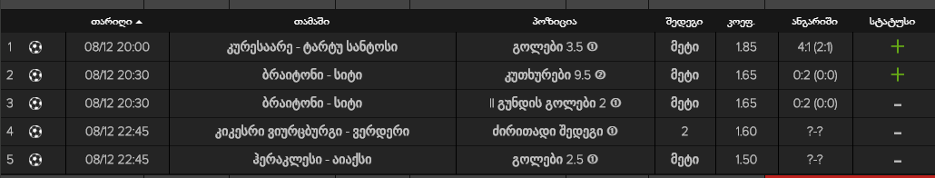 პსვეს მოგება რატომ არ ავიღე ალკმააღთან არ ვიცი სულ უგებს მაგ გუნდს ამ ბოლო დროს, ევერრტონის მოგება მეგონა მაგრამ 5 კაცი აკლდა და ვერ გავრისკე იმიტომაც მოიგო ძლივს