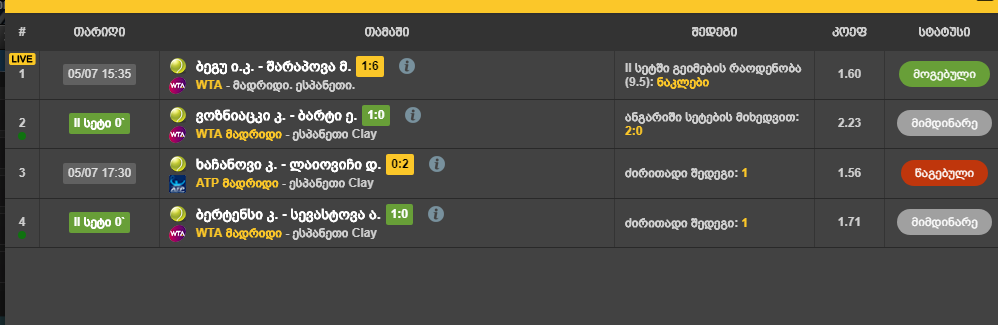 ლიდერ ბეტის დედას ###### ხანჩანოვზე მაჩვენებდა რო 6:3 მოიგო სეტი და თურმე პირიქით წაუგია მაგ ###ს იქით კიდე სხვა თამაშს ვუყურებდი და აღარ მივაქციე ყურადღება მეთქი მოვიგე და ეგაათქო ამის