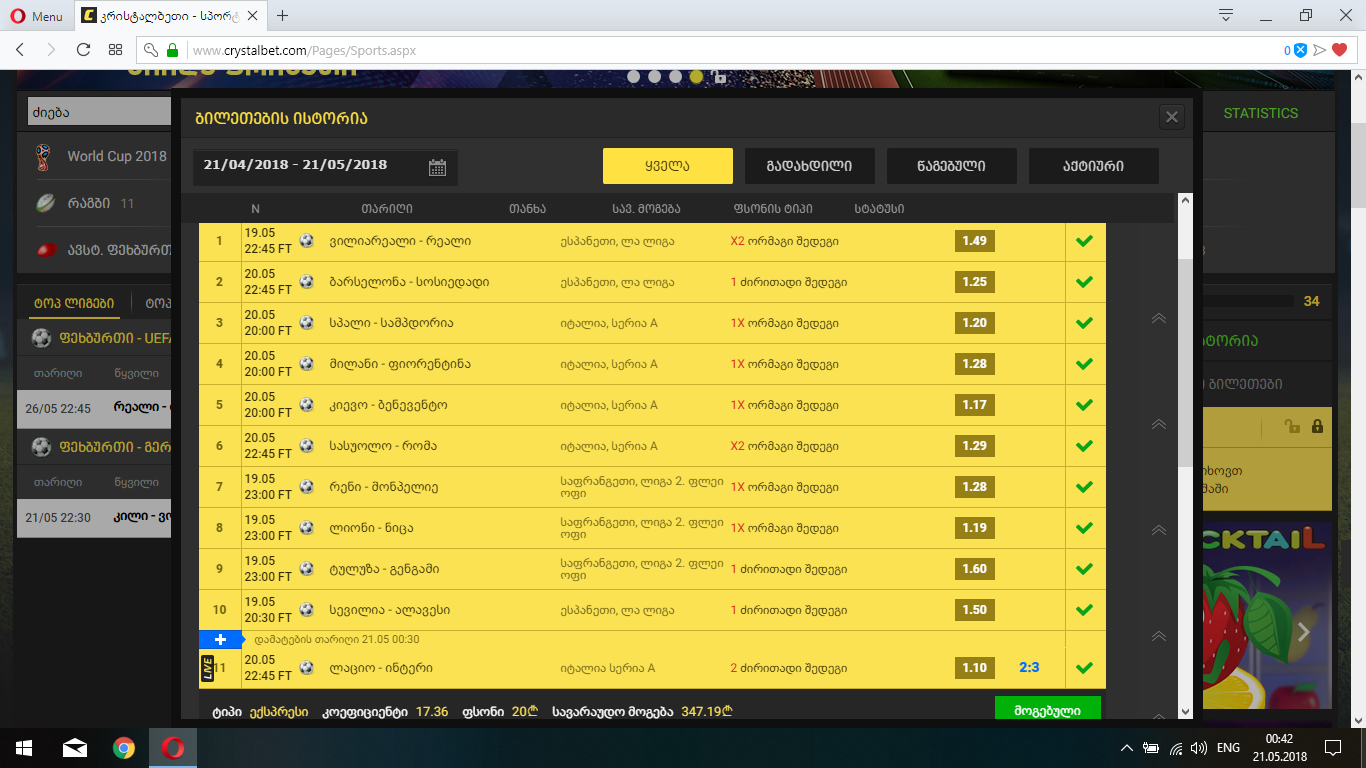 პ.ს კრისტალბეთზე მედო ინტერის მოგება დაბეჭდილ ბილეთში და 24 საათიანი სალარო არის სადმე რომ გავანაღდო ეხლა?