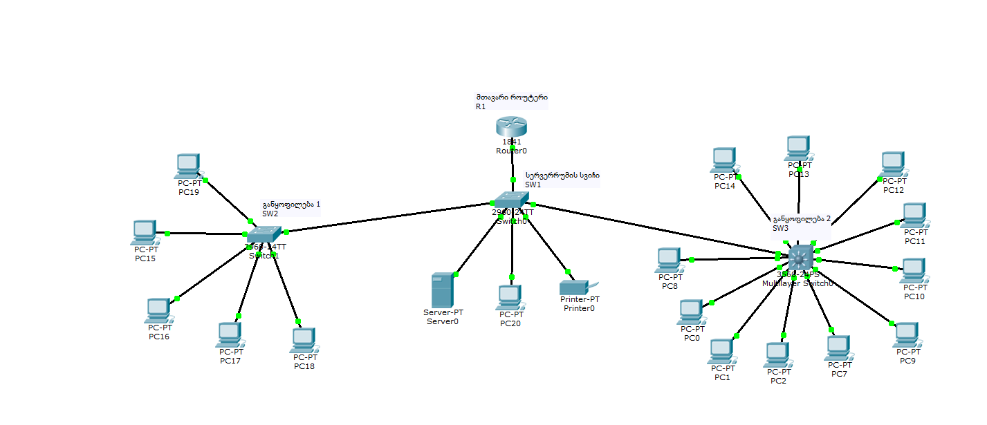 მინიმალური კონფიგურაცია რითიც იმუშავებს შენი მოცემული ტოპოლოგიით აწყობილი ქსელი (სტატიკური როუტინგით) და ასევე განყოფილება2-ის სტაფი ვერ მიწვდება განყოფილება1-ის სტაფს.