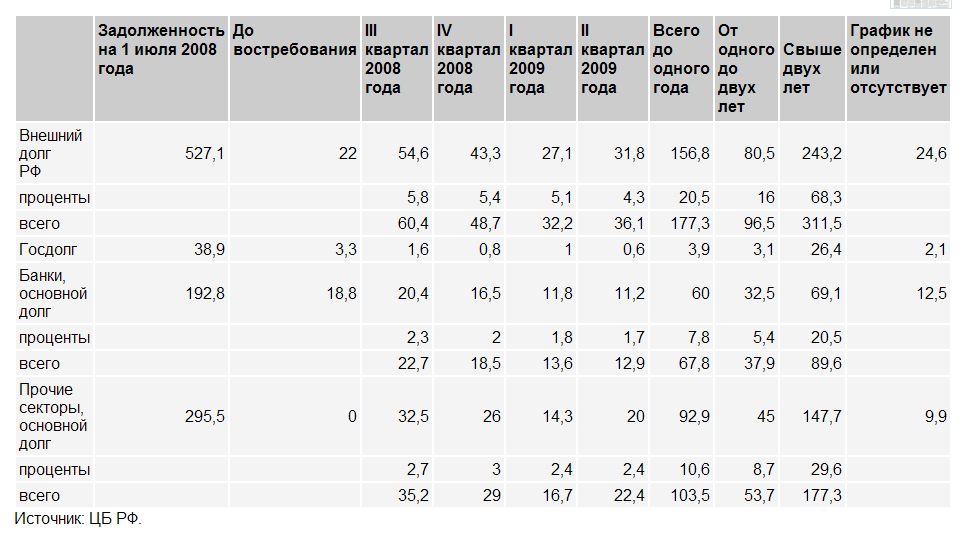 Между тем и следующий, 2009 год обещает быть непростым: банкам и компаниям надо будет вернуть 115,7 млрд долларов. И это только четверть всех внешних обязательств российской экономики.