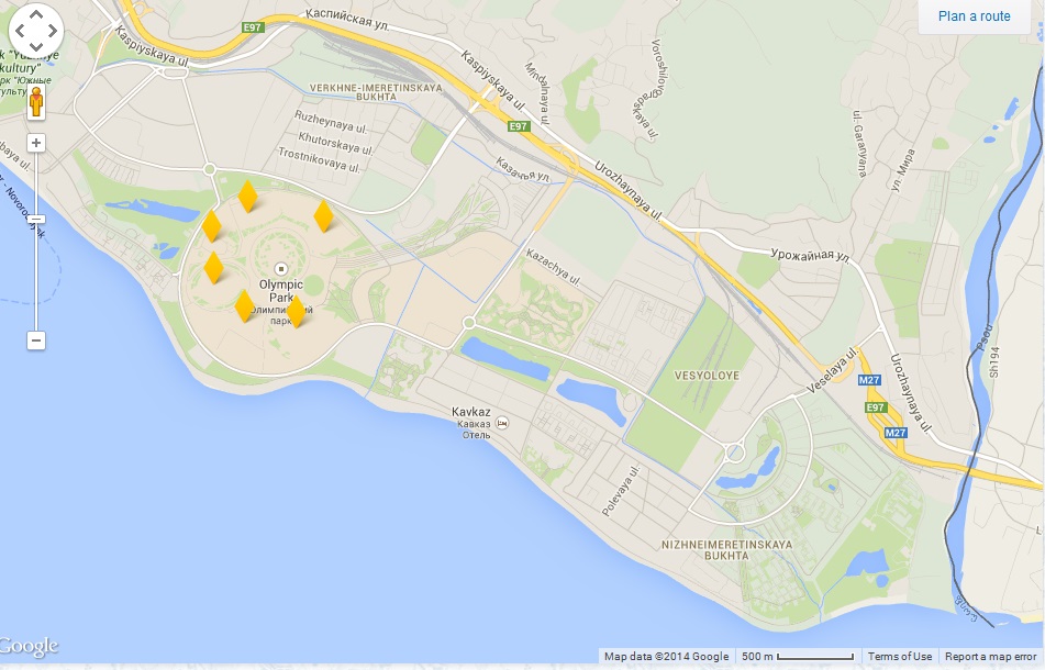 მარჯვნივ არის ფსოუ, მრგვალი - ოლიმპიური პარკი. დააკვირდი რუკის მასშტაბს. საზღვრიდან ოლიმპიადის ცენტრამდე არის 5 კილომეტრი.
