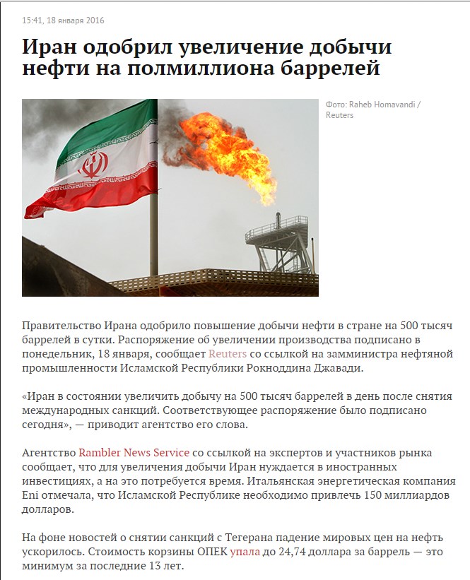 ისტორიული შეთანხმება მიღწეულია - ირანი ევროპის ბაზარზე ბრუნდება. 4-წლიანი აკრძალვის შემდეგ, სულ მალე, თეირანი ევროპაში ნავთობის გატანას დაიწყებს და ნავთობის ბაზარზე "შავი დღეების" მოლოდინია. პროგნოზები კეთდება, რომ ბრენტის მარკის ბარელი ნავთობის 29 დოლარამდე ჩამოქცეულ ფასებს კიდევ უფრო გაუფასურება ელის და ის შესაძლოა გასული საუკუნის 90-იანი წლების მინიმუმს - 17-18 დოლარსაც კი მიუახლოვდეს.