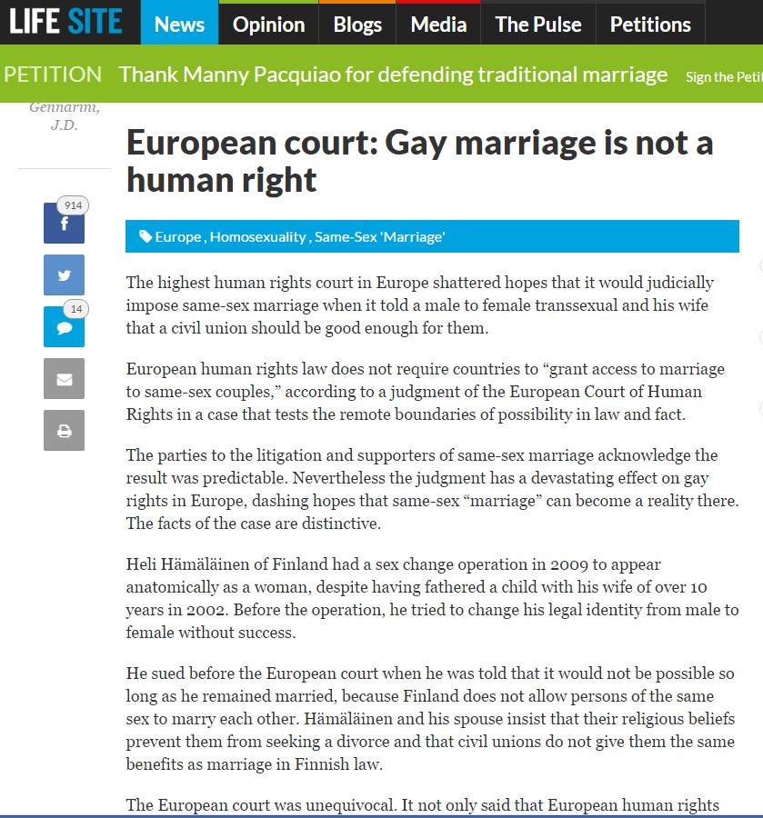 სასამართლომ, ეს გადაწყვეტილება მიიღო ფინელი მოქალაქის საჩივრის პასუხად, რომელიც მიუხედავად ოპერაციისა და საერთო შვილისა, ვერ ახერხებდა იურიდიული იდენტობის შეცვლას მამაკაციდან-ქალად, რელიგიური აღმსარებლობა კი განქორწინებას უკრძალავდა. ევროპულმა სასამართლომ გადაწყვიტა, რომ ის მამაკაცად დარჩება, სანამ ფინეთი არ აღიარებს მსგავსი-სქესის პირთა შორის ქორწინებას საკანონმდებლო დონეზე (ამჟამად ახლა უკვე მიღებულია და ძალაში შევა 2017 წლიდან).