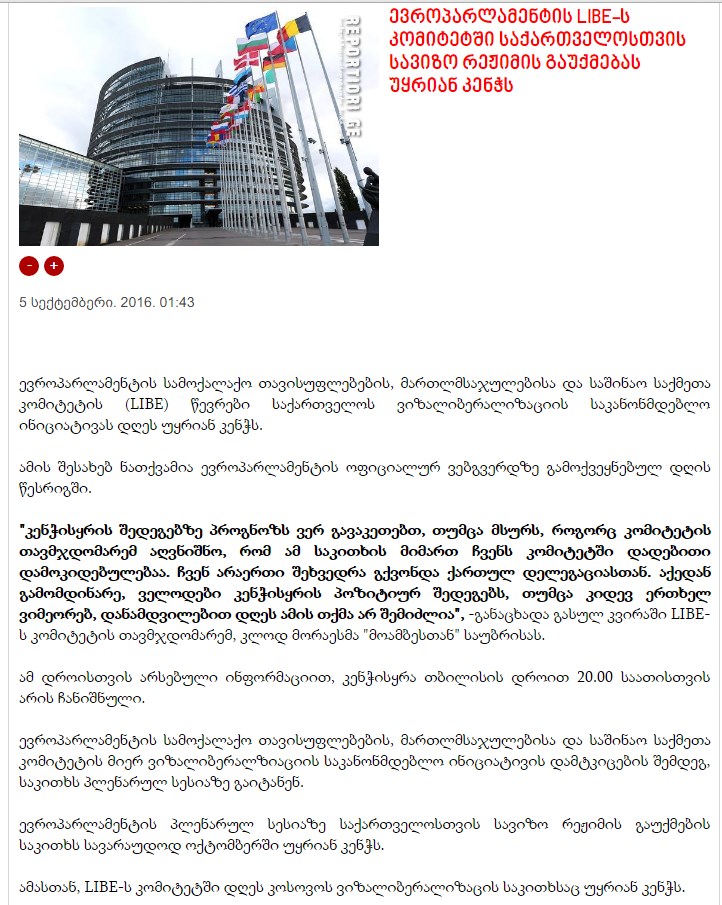 http://2030.news/?newsid=13281ევროპარლამენტის სამოქალაქო თავისუფლებების, მართლმსაჯულებისა და საშინაო საქმეთა კომიტეტმა (LIBE) საქართველოს ვიზალიბერალიზაციის საკანონმდებლო ინიციატივას მხარი დაუჭირა. საქართველოს მოქალაქეებისთვის სავიზო რეჟიმის გაუქმებას კომიტეტის 44 წევრმა მისცა ხმა, წინააღმდეგი ხუთი იყო.