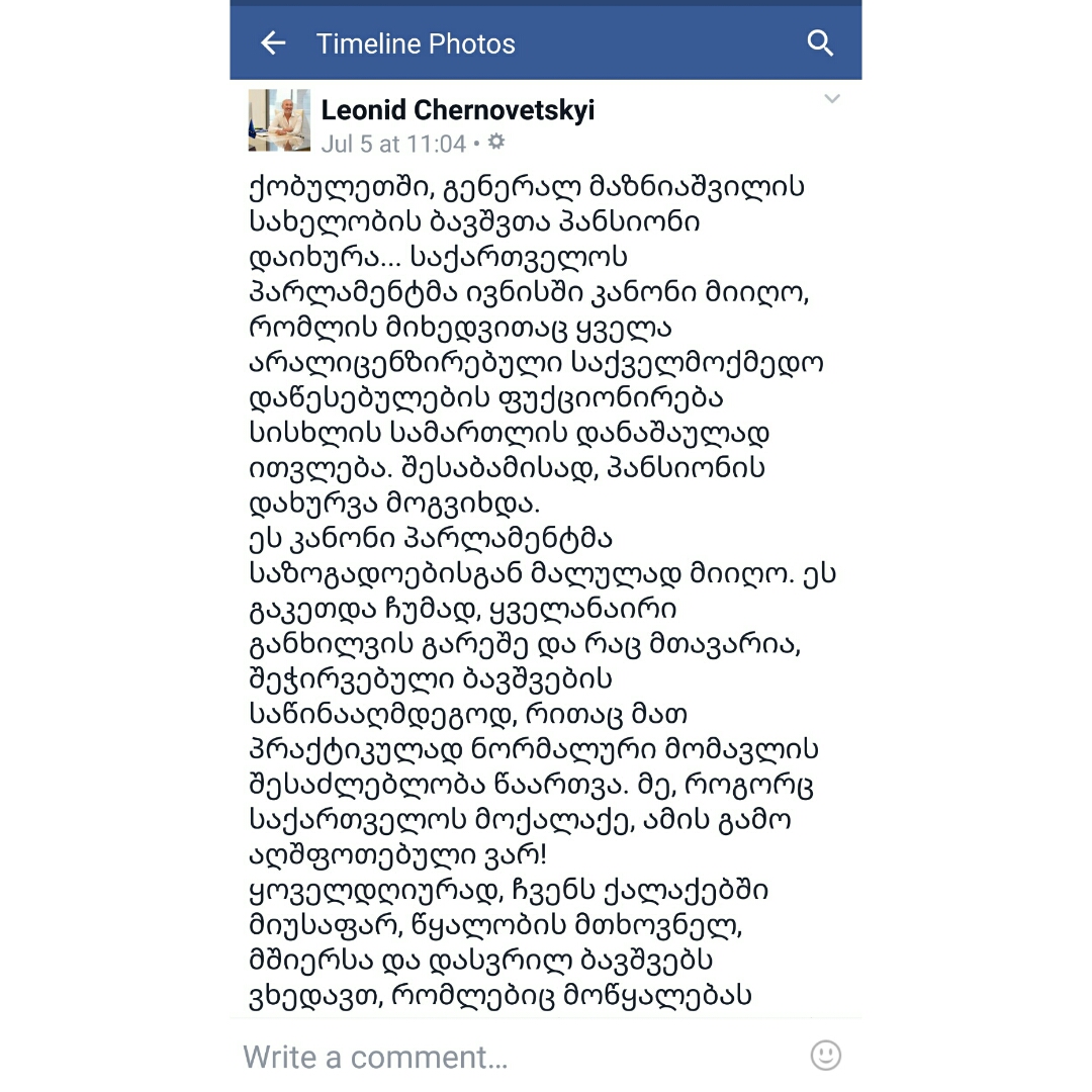 ეს კანონი პარლამენტმა საზოგადოებისგან მალულად მიიღო. ეს გაკეთდა ჩუმად, ყველანაირი განხილვის გარეშე და რაც მთავარია, შეჭირვებული ბავშვების საწინააღმდეგოდ, რითაც მათ პრაქტიკულად ნორმალური მომავლის შესაძლებლობა წაართვა. მე, როგორც საქართველოს მოქალაქე, ამის გამო აღშფოთებული ვარ!