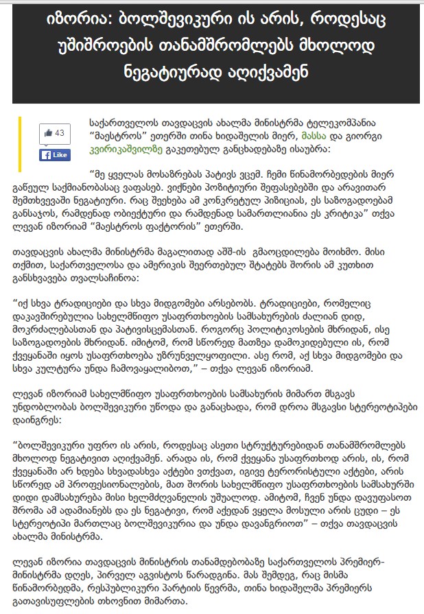 ლევან იზორია - თავდაცვის ახალი მინისტრის უმთავრესი პრიორიტეტი საღი გონების პოლიტიკა იქნება თავდაცვის ახალი მინისტრის უმთავრესი პრიორიტეტი საღი გონების პოლიტიკა იქნება, - ამის შესახებ ლევან იზორიამ უწყების თანამშრომლებთან შეხვედრისას განაცხადა.