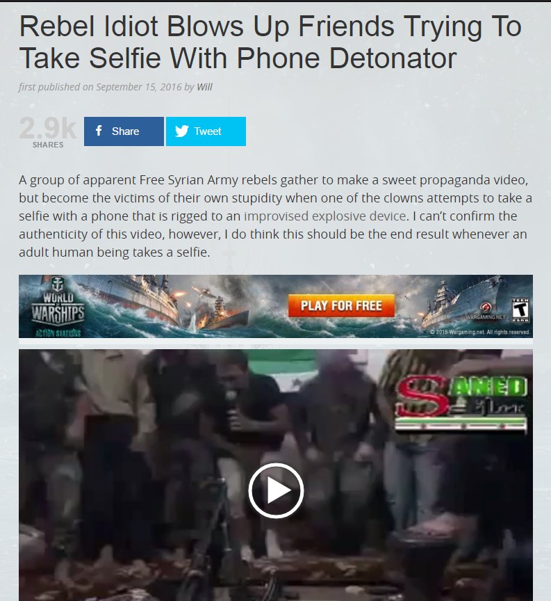 სირიის არმიის რებელები პროპაგანდისტული ვიდეოს გადასაღებად შეგროვდნენ, იმღერეს და ბოლოს საკუთარი სიშტერის მსხვერპლი გახდნენო - ერთ-ერთმა მოინდომა სელფის გადარება მობილურით, რომელიც დეტონატორი იყო