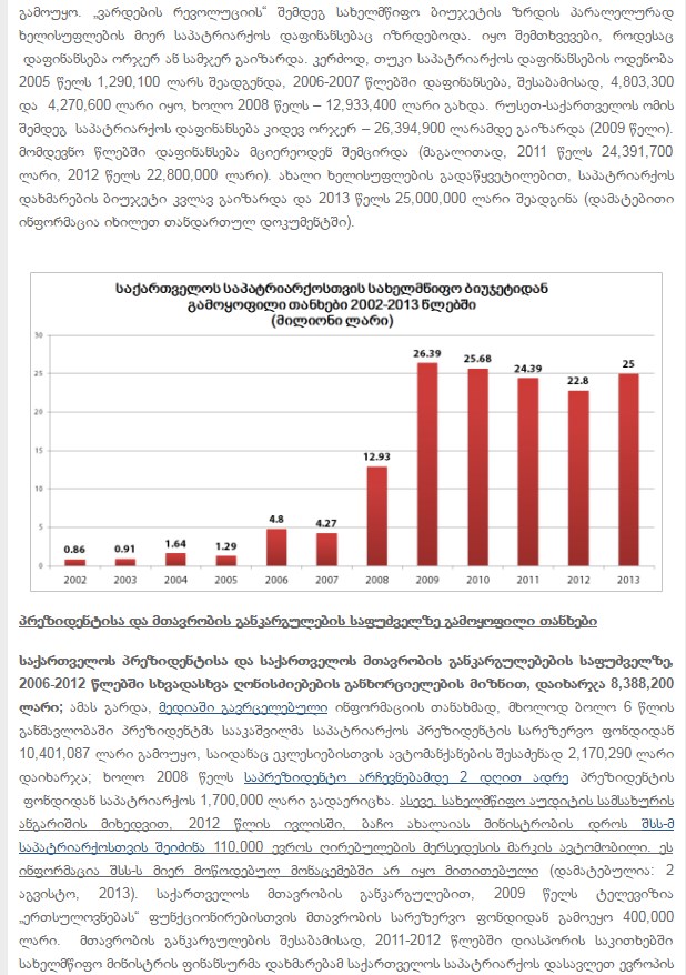 დარიალის ხეობაში საეკლესიო კომპლექსის მშენებლობაში დახმარების მიზნით აღნიშნულ ფონდთან ინფრასტრუქტურის სამინისტროს საკუთრებაში არსებულმა „სახელმწიფო სამშენებლო კომპანიამ“ 2 მილიონი ლარის საერთო ღირებულების ოთხი ხელშეკრულება გააფორმა. ხელშეკრულებათა უმეტესობა 2011 წლის პირველ ნახევარზე მოდის და მათგან უმსხვილესი (936,000 ლარი) ფონდს გამარტივებული შესყიდვების პროცედურების გზით მიენიჭა 2011 წლის 15 აგვისტოს.