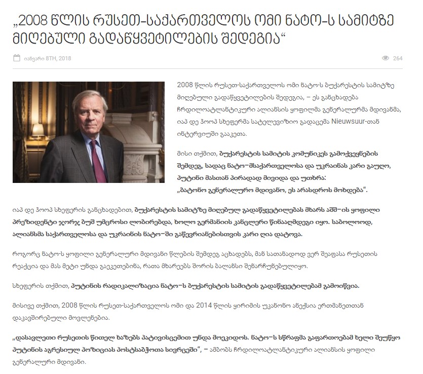 სტატიაში თქვენ გამოდიხართ რეკომენდაციით, საქართველო დაჩქარებულად გახდეს ნატოს წევრი და კოლექტიური თავდაცვის შესახებ მეხუთე მუხლი არ გავრცელდეს ოკუპირებულ რეგიონებზე.