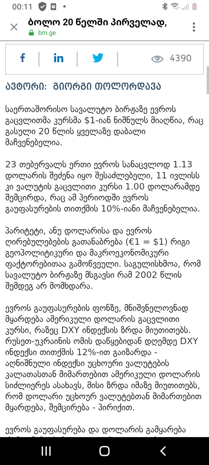 ბოლო 20 წელიწადში პირველად ევრო დოლარს გაუთანაბრდა